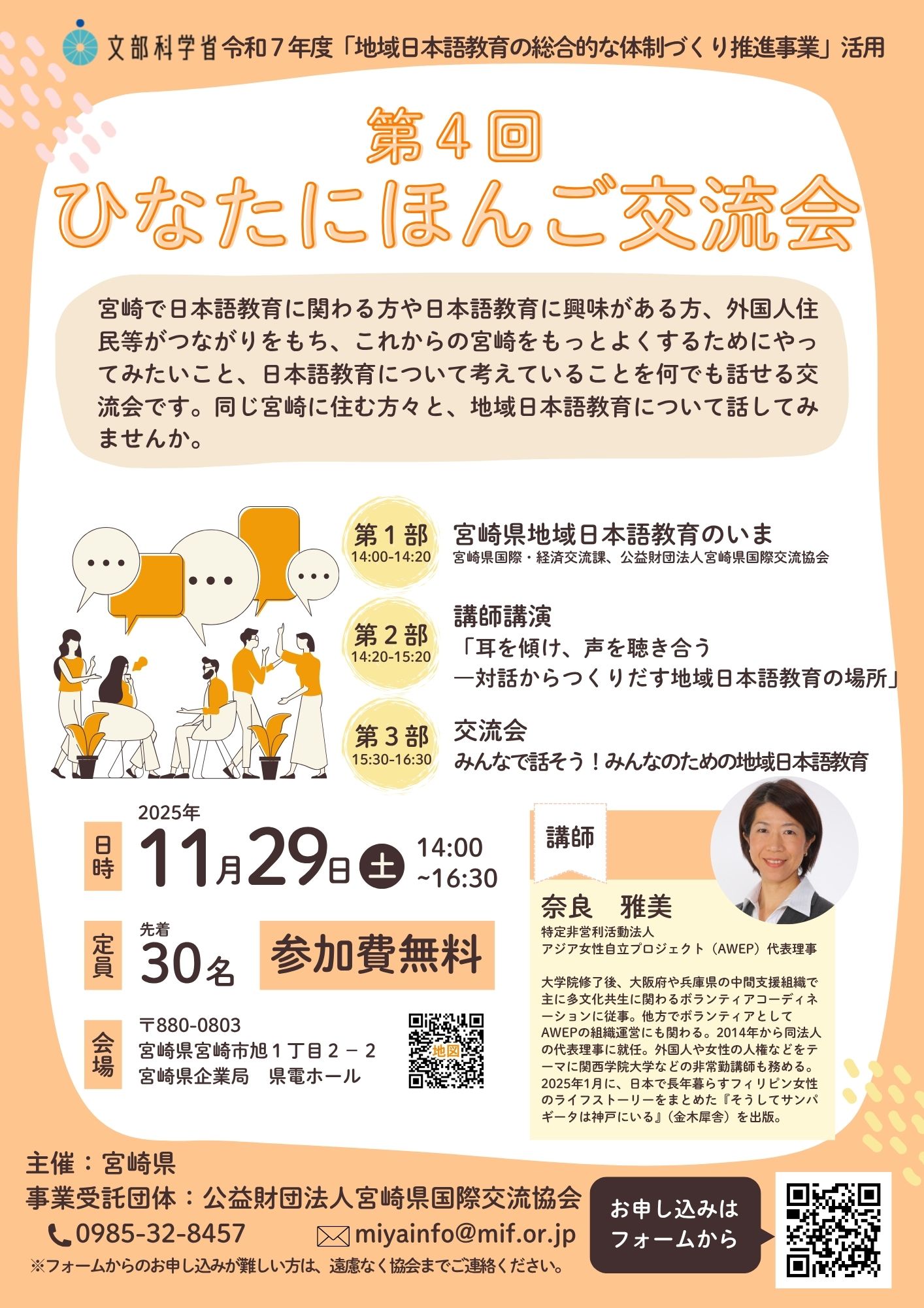 下記のとおり、宮崎県内の日本語教育・学習に関わる人たちがつながりを持ち、それぞれの活動や実践をよりよくできるよう、なんでも話せる交流会を開催します。日本語教育の日頃の活動、あるいはこれからやってみたいと考えていることを、同じ興味や関心、問題意識を持つ仲間と一緒に話してみませんか?